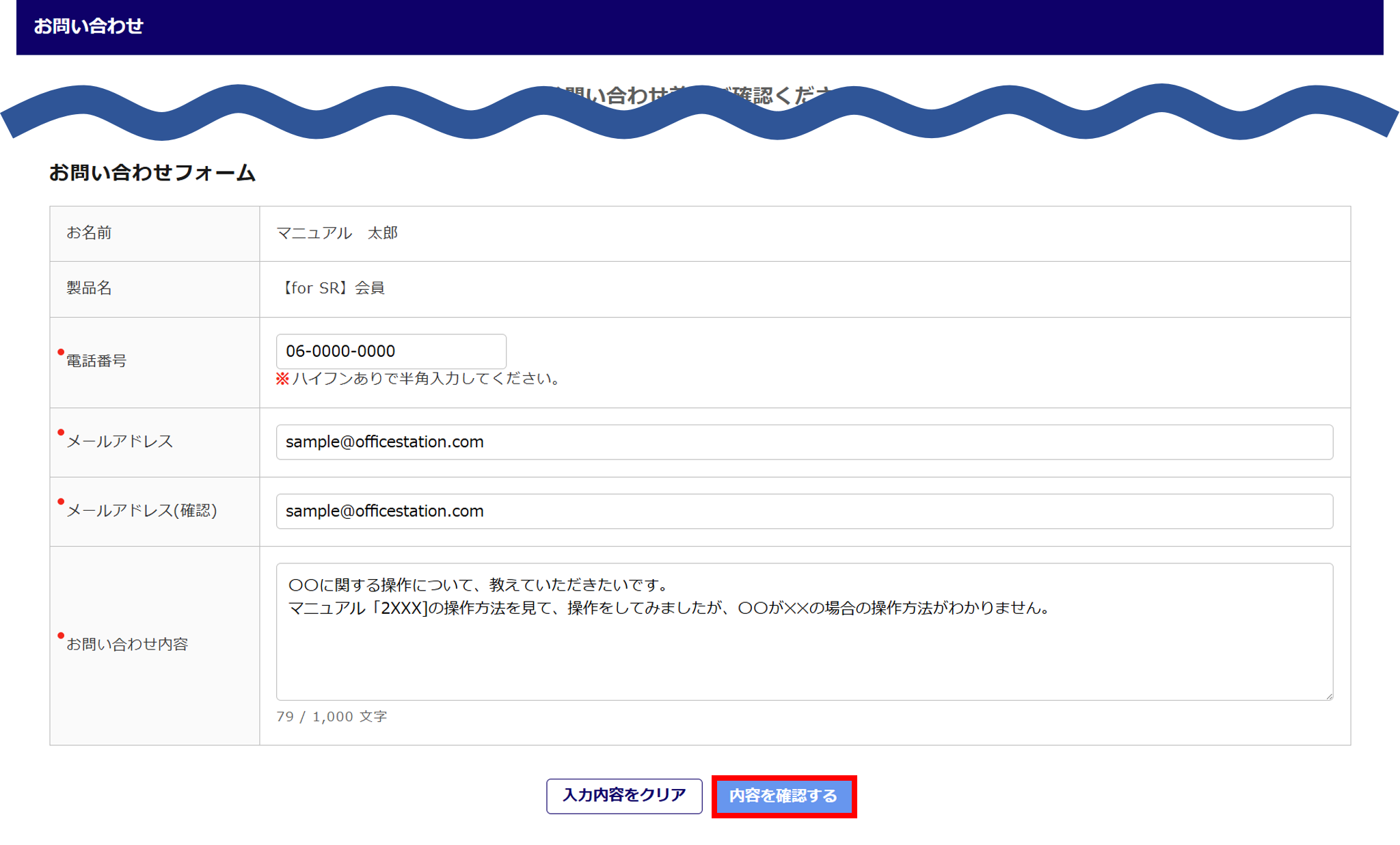各項目を入力し、[内容を確認する]をクリックします。