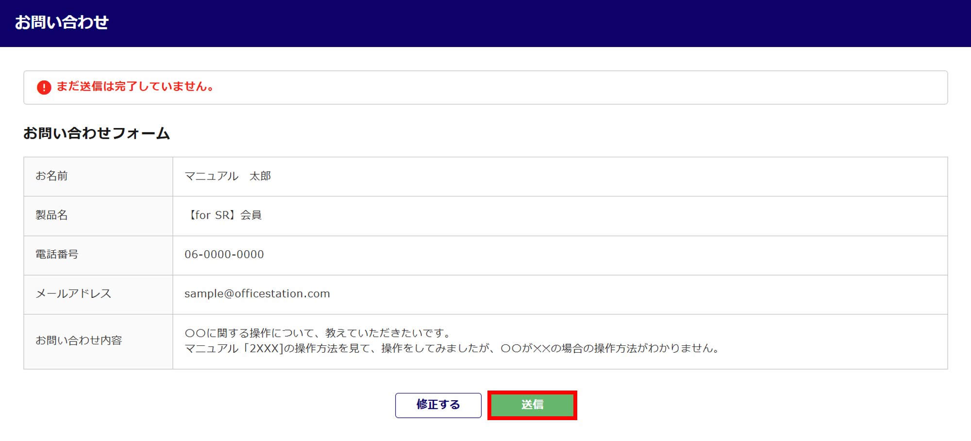 内容を確認後、[送信]をクリックします。
