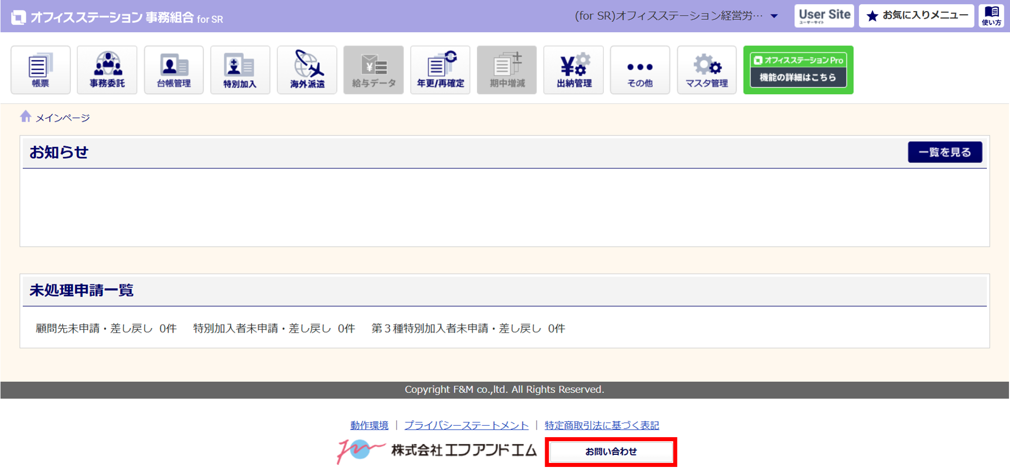 システム画面下部の[お問い合わせ]をクリックします。