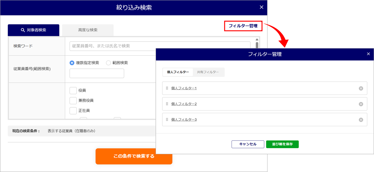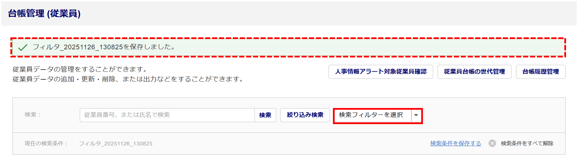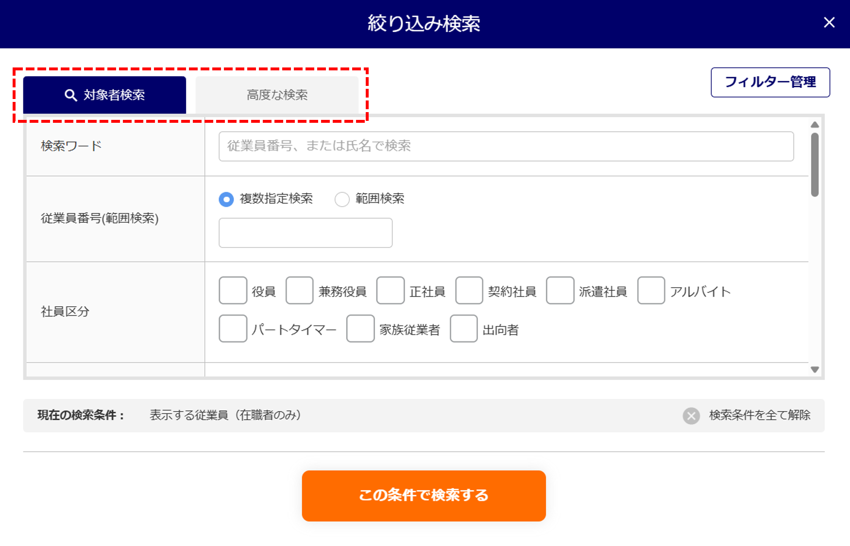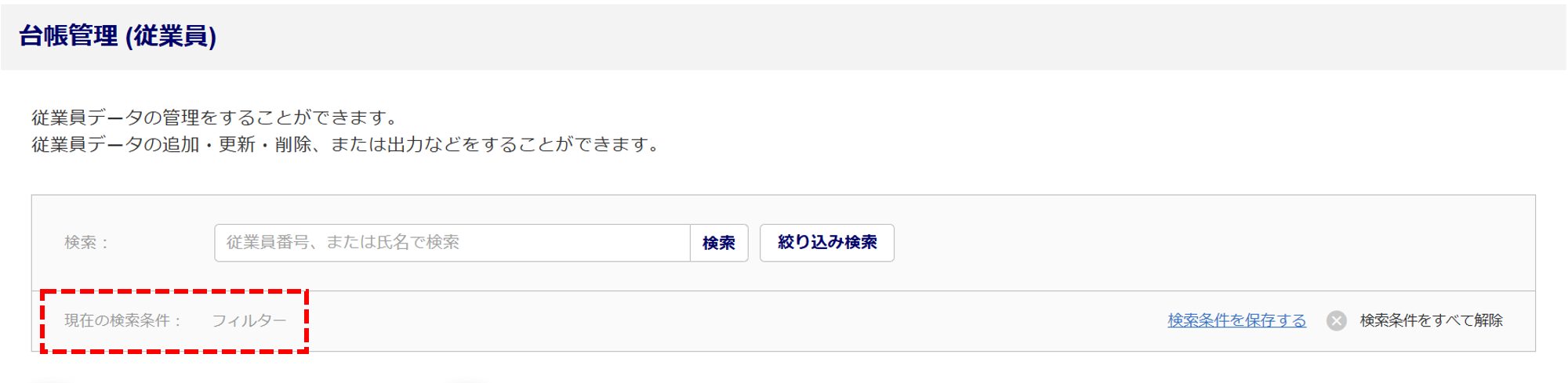 「現在の検索条件:フィルター」と表示され、絞り込んだ従業員が表示されます。