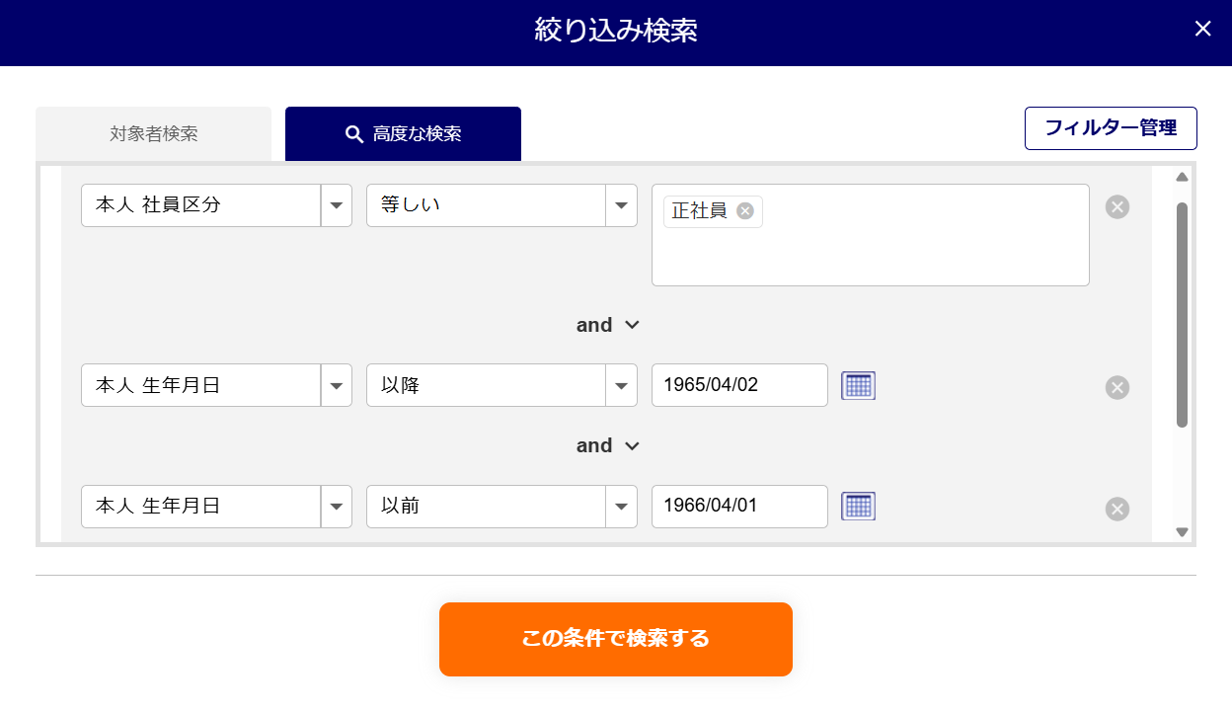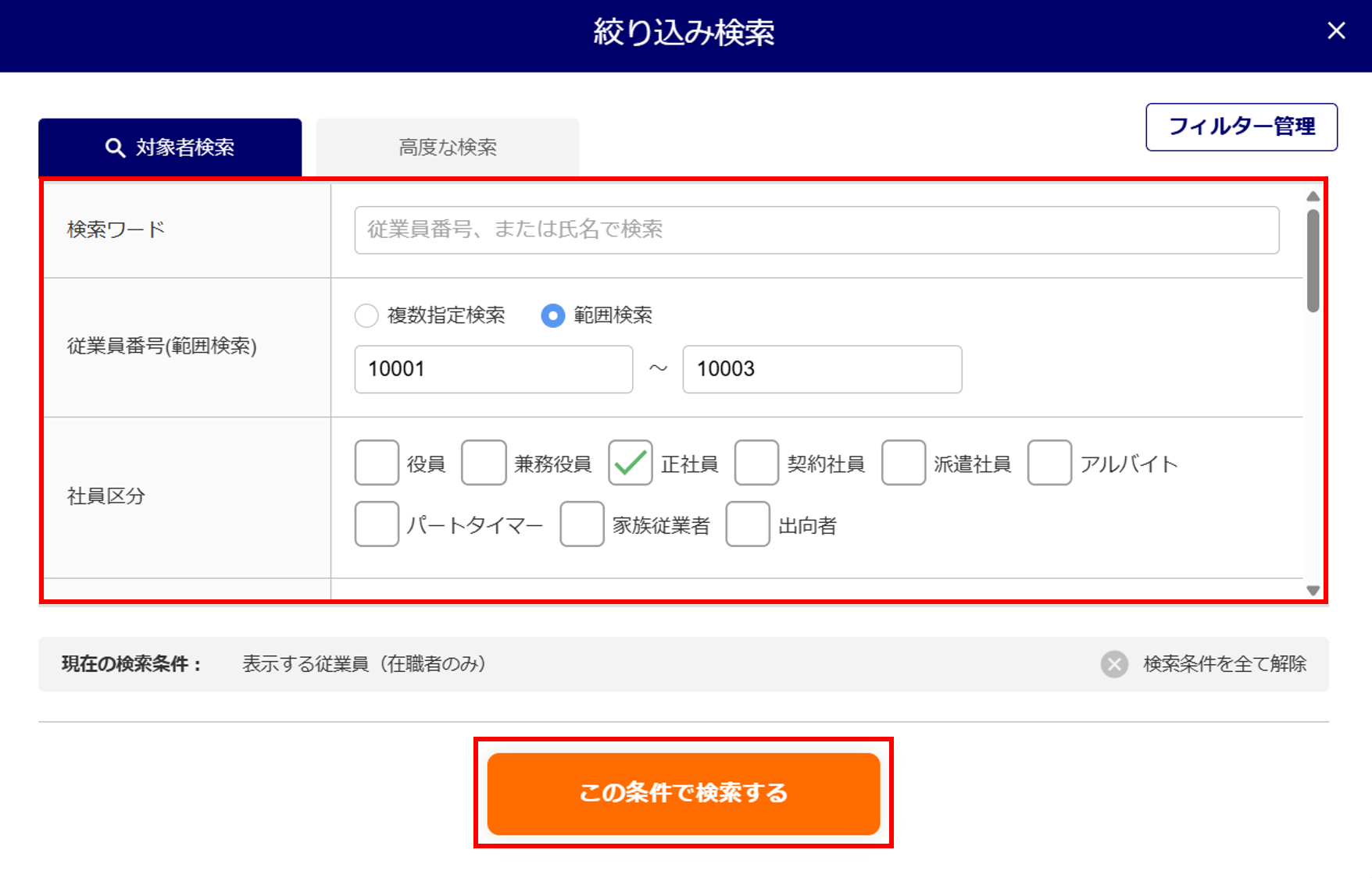 「従業員番号」や「社員区分」などの絞り込みたい情報を設定し、[この条件で検索する]をクリックします。