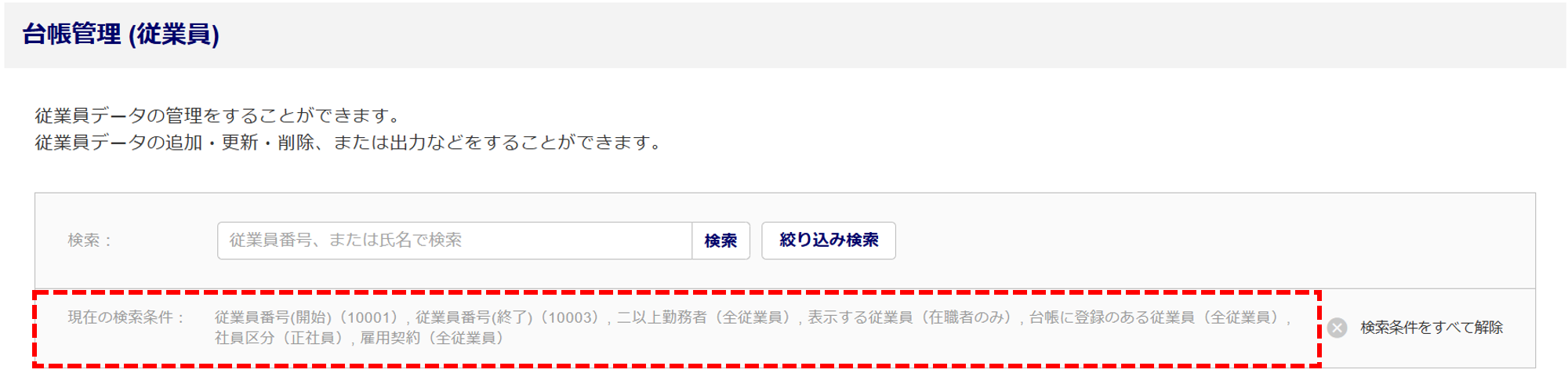「現在の検索条件」が表示され、絞り込んだ従業員が表示されます。