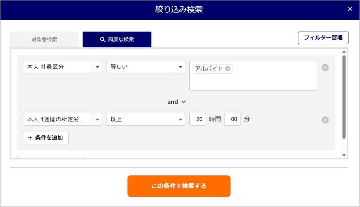 例1)社員区分がアルバイトで週20時間以上の所定労働時間の方を検索する場合