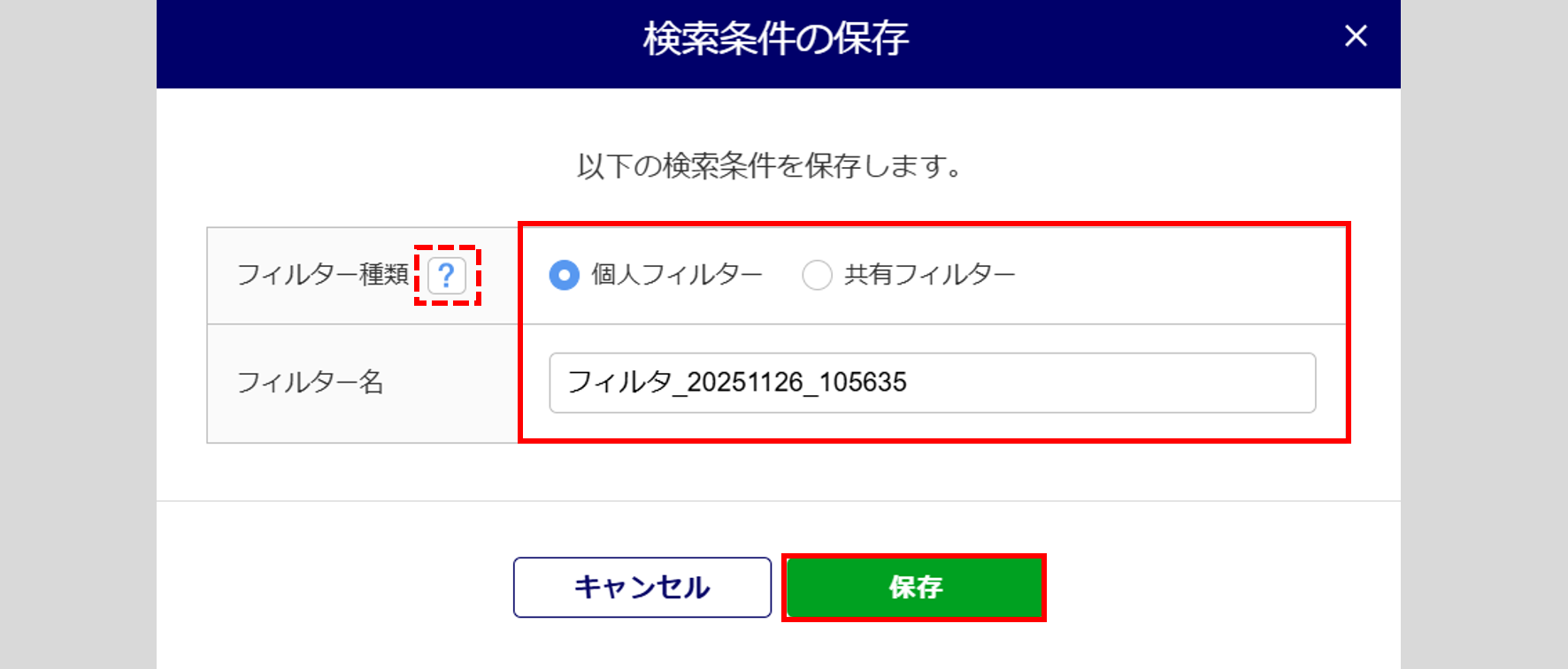 「フィルター種類」「フィルター名」を設定後、[保存]をクリックします。