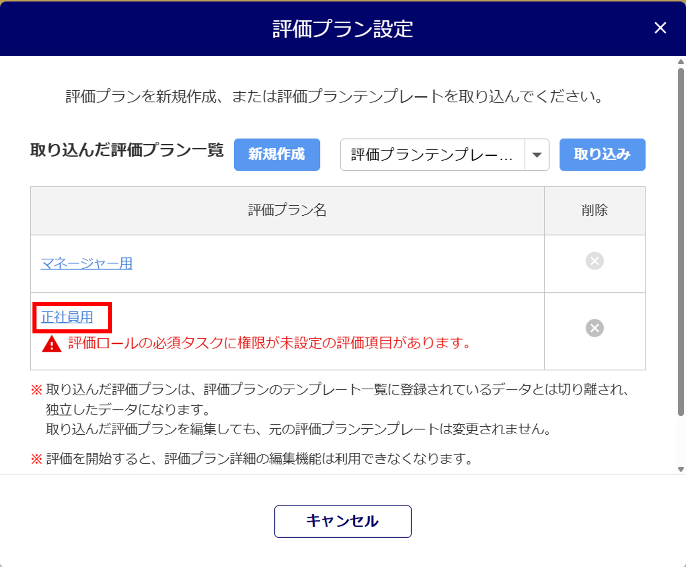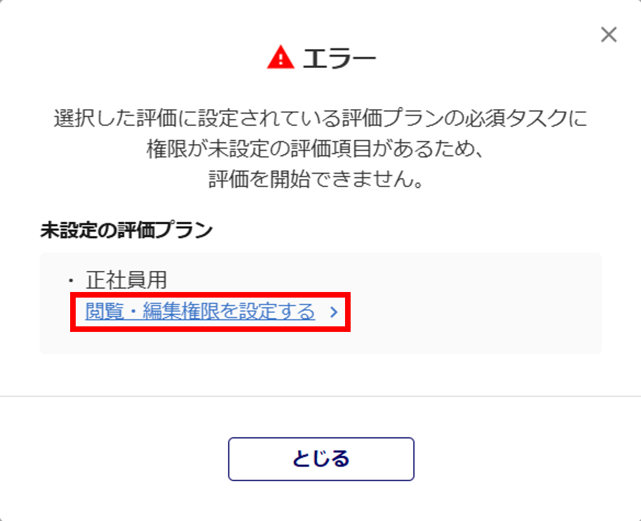 評価プロジェクト詳細にて、「閲覧・編集権限設定」が未設定の評価プランを取り込むと、本エラーが表示され、評価の開始をおこなうことができません。