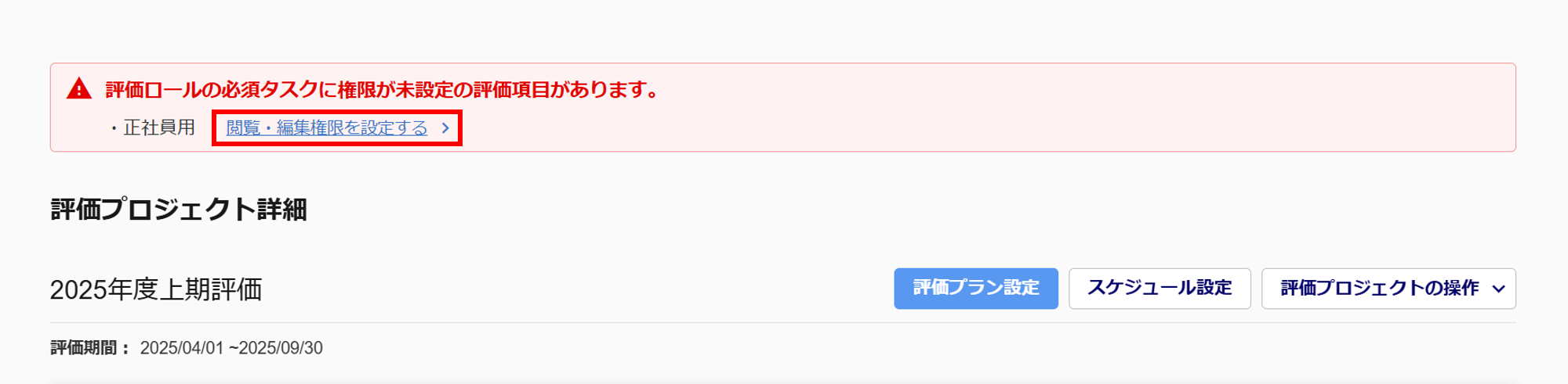 評価プロジェクト詳細にて、「閲覧・編集権限設定」が未設定の評価プランを取り込むと、本エラーが表示され、評価の開始をおこなうことができません。