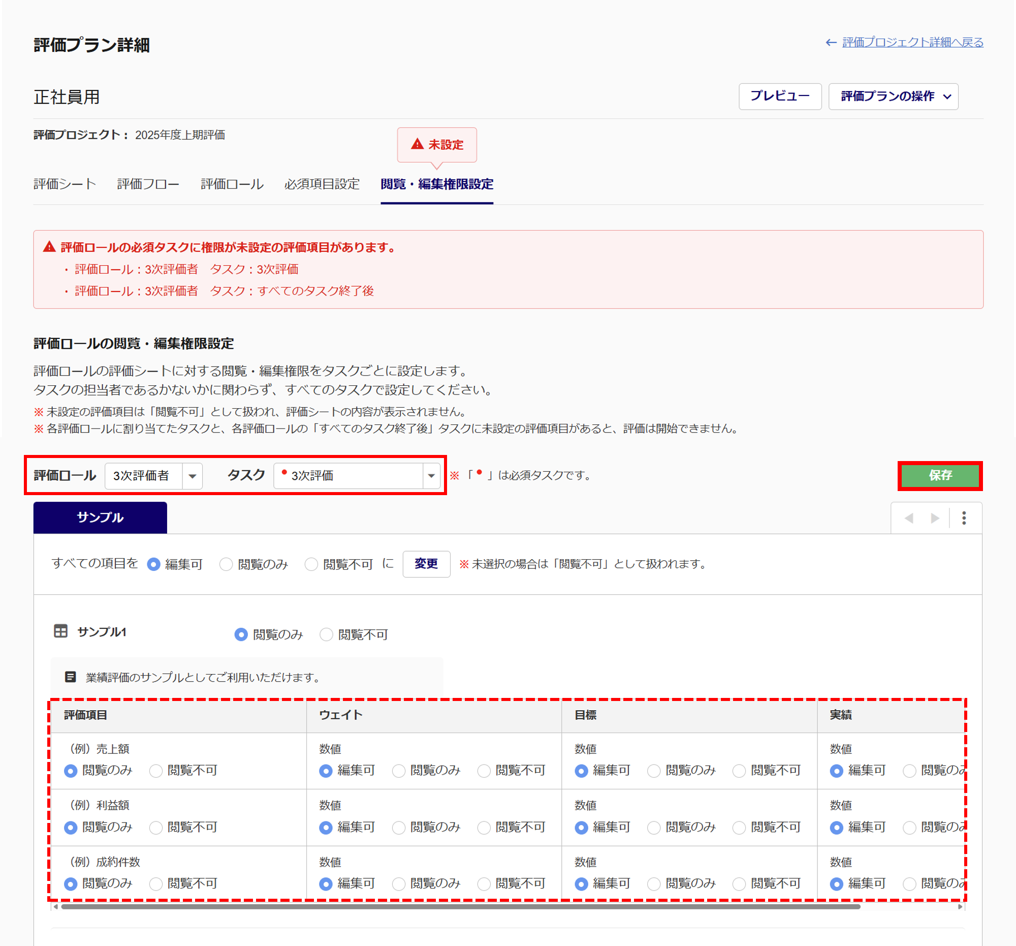 エラー対象となる評価ロール者のタスクに閲覧・編集権限設定をおこない、設定後、[保存]をクリックします。