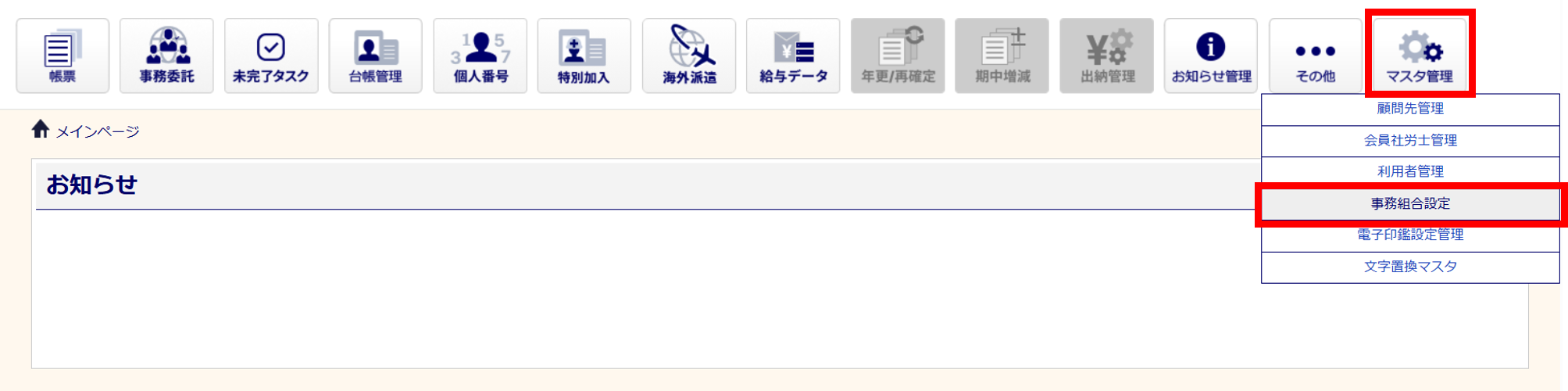 [マスタ管理]>[事務組合設定]をクリックします。