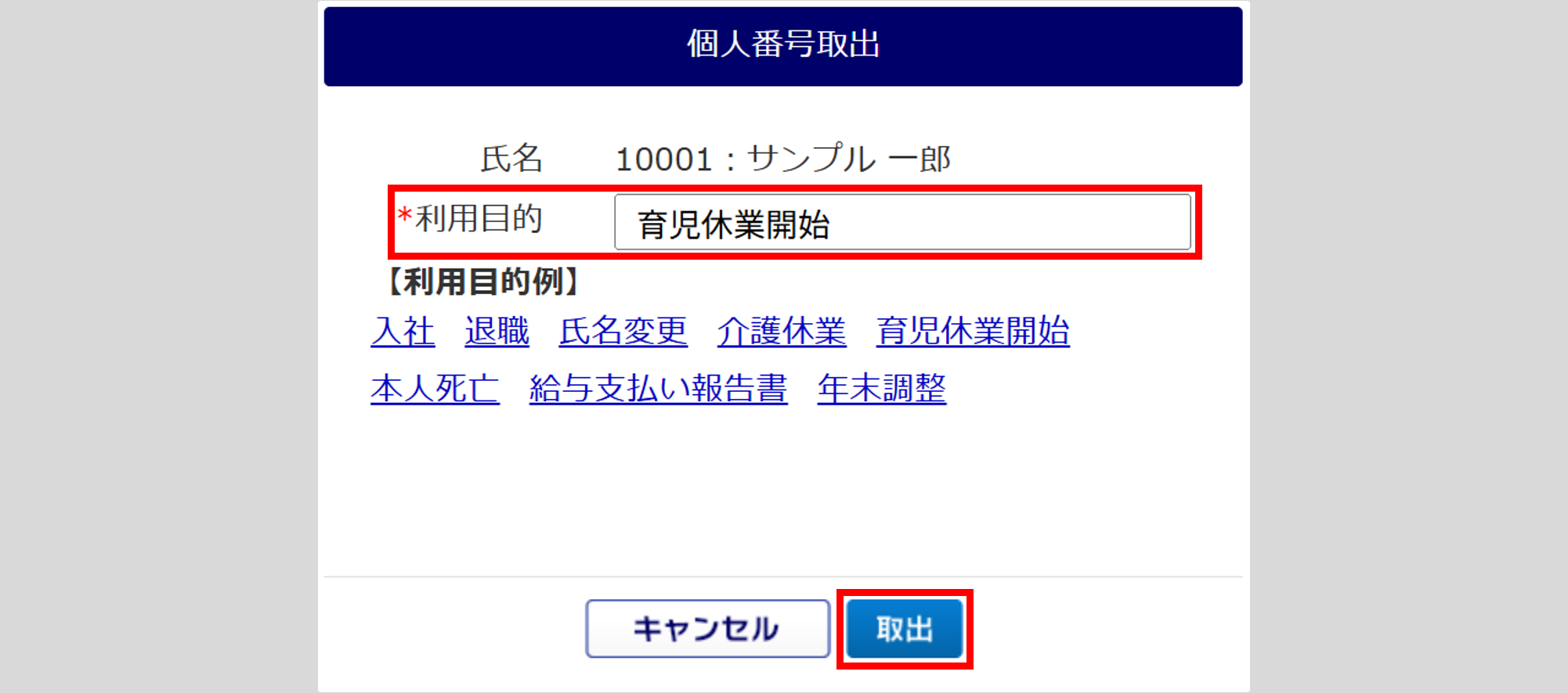 「利用目的」を入力し、[取出]をクリックします。