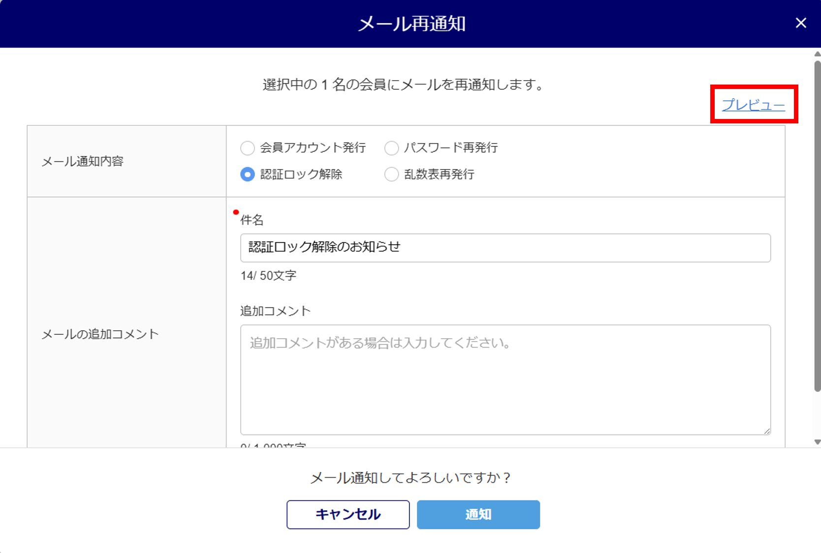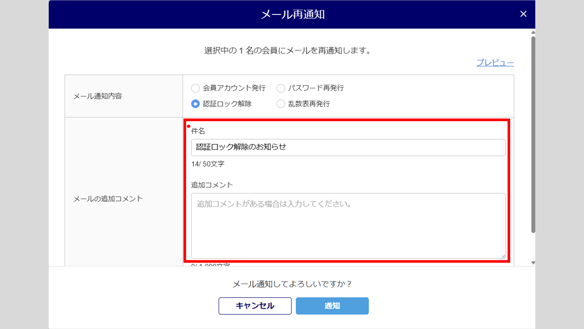 通知メールの「件名」と、「追加コメント」を必要に応じて修正、入力します。