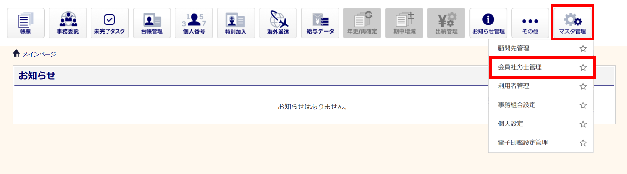 [マスタ管理]>[会員社労士管理]をクリックします。