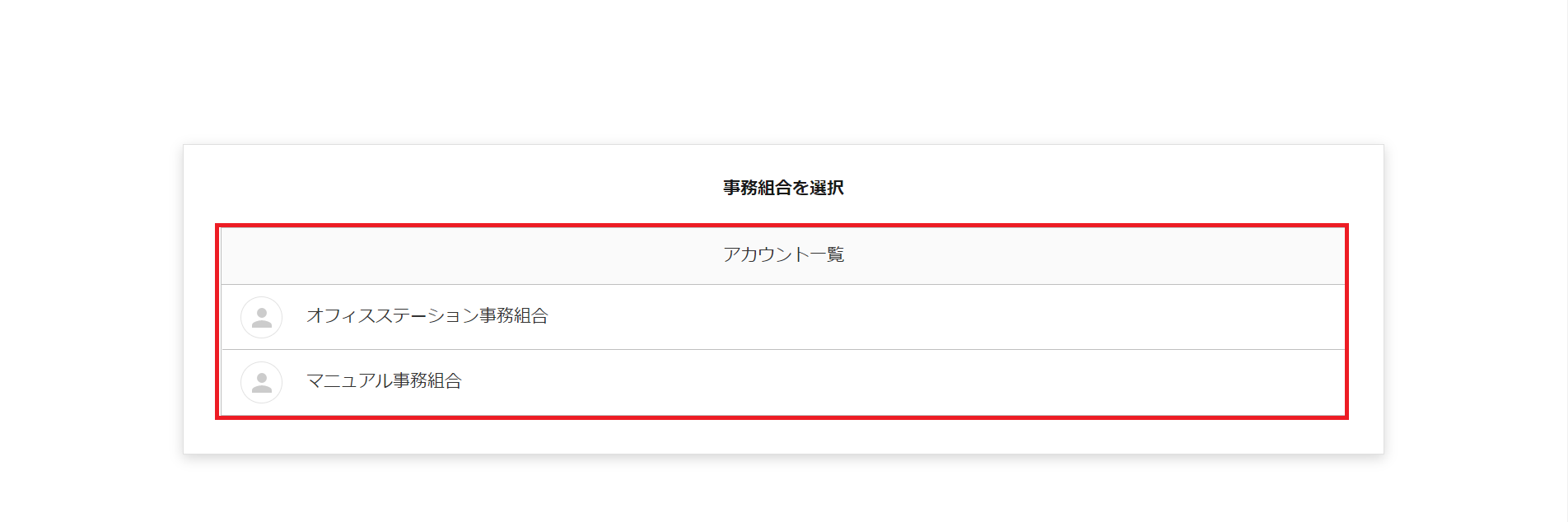 事務組合機能のみ利用する場合も、他の利用者同様に自身のログインIDと、パスワードでログインします。ログイン後、オフィスステーション本体の画面は表示されず、事務組合機能の画面が表示されます。なお、複数の事務組合情報が利用できる設定の場合には、ログイン後事務組合を選択する画面が表示されますので、事務組合機能を立ち上げる情報を選択してください。