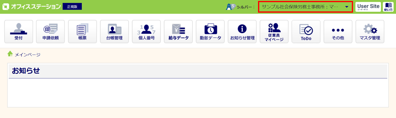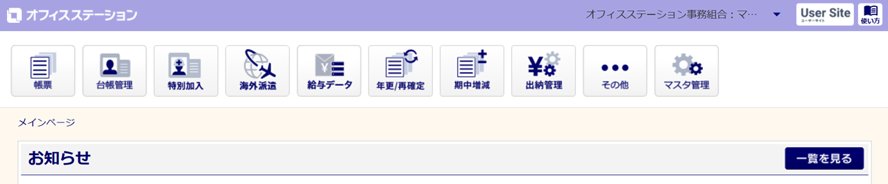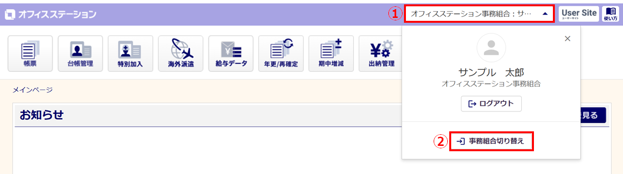 他の事務組合に切り替える場合、 メインページ右上「屋号:担当者名」>[事務組合切り替え]をクリックします。