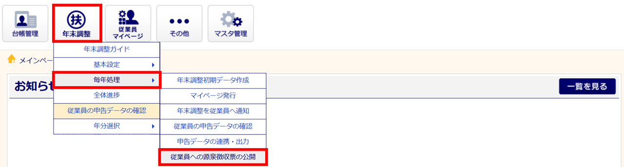 [年末調整]>[毎年処理]>[従業員への源泉徴収票の公開]をクリックします。