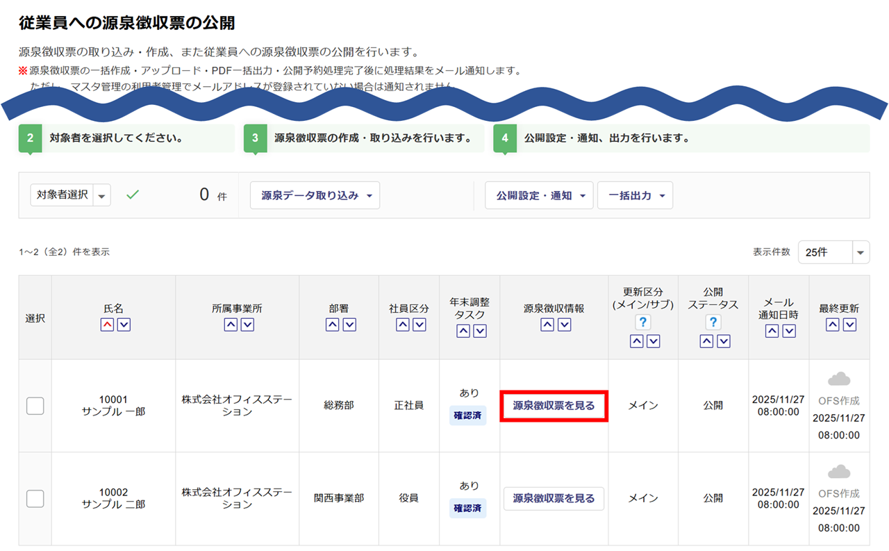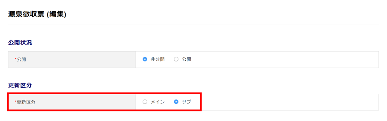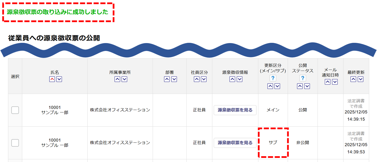 「源泉徴収票公開設定」画面に戻り、「更新区分(メイン/サブ)」列に、選択した更新区分が表示されたら、2枚目の源泉徴収票の作成は完了です。