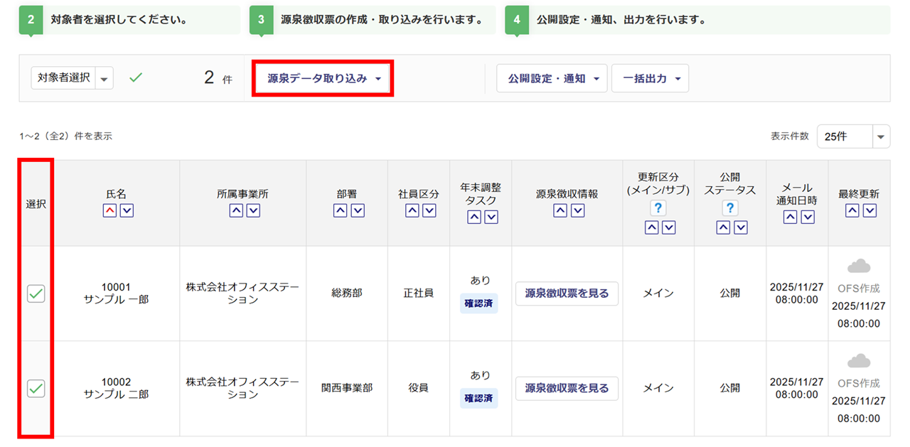 2枚目の源泉徴収票を作成する従業員の「選択」列にチェックし、[源泉データ取り込み]をクリックします。