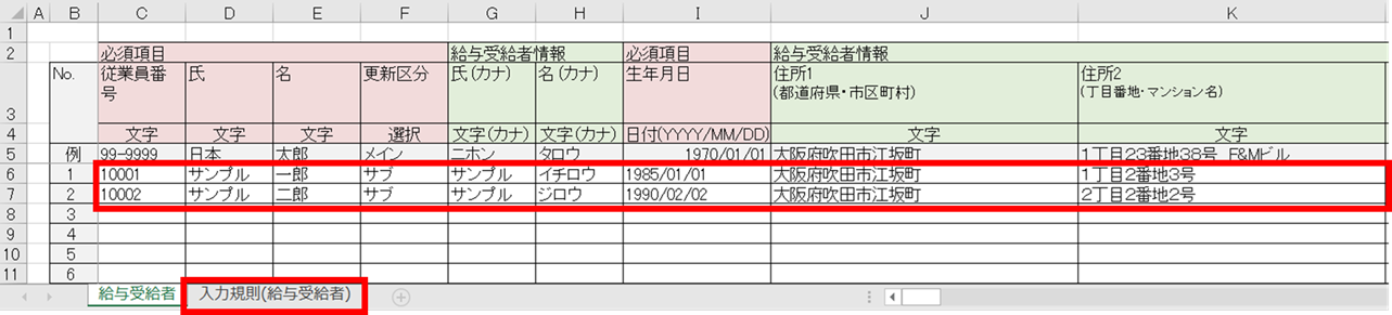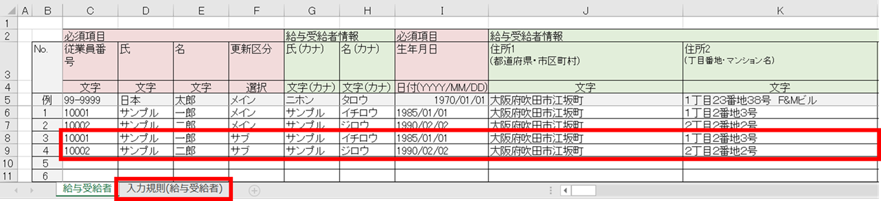 ※1枚目が「サブ」の場合は、「メイン」を選択してください。※各項目の入力規則については、「入力規則(給与受給者)」シートをご確認ください。
