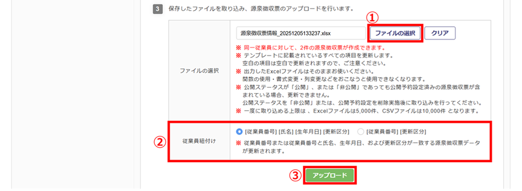 「従業員紐付け」(②)を選択し、[アップロード](③)をクリックします。