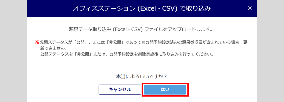 [ファイルの選択]をクリックし、取り込みをおこなうファイルを選択、[アップロード]>[はい]をクリックします。