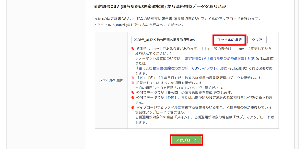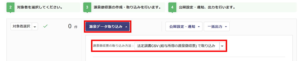 法定調書CSV(給与所得の源泉徴収票)または給与支払報告書XMLで取り込み