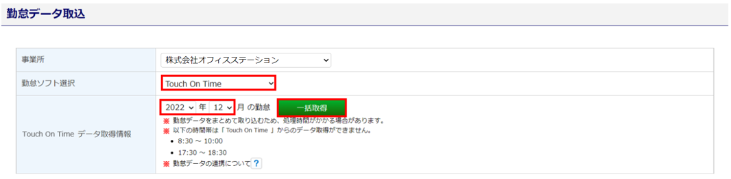| Touch On Time データ取得情報 | 取り込む勤怠データの年月を選択します。 |