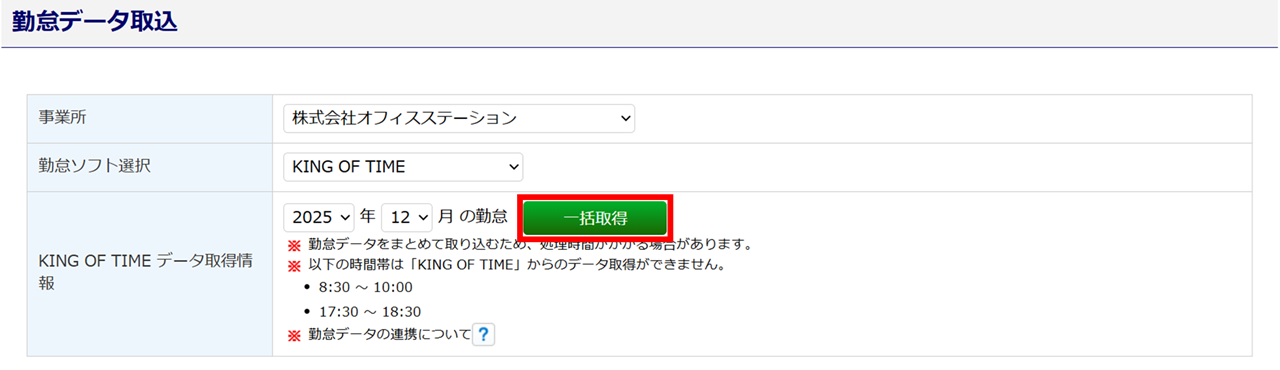 | KING OF TIME データ取得情報 | 取り込む勤怠データの年月を選択します。 |
