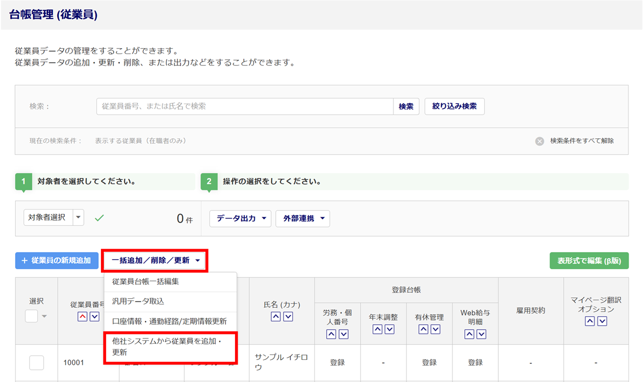 [一括追加/削除/更新]>[他社システムから従業員を追加・更新]をクリックします。