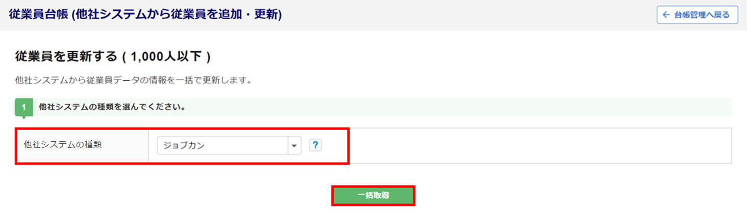 「他社システムの種類」にプルダウンから「ジョブカン」を選択し、[一括取得]をクリックします。