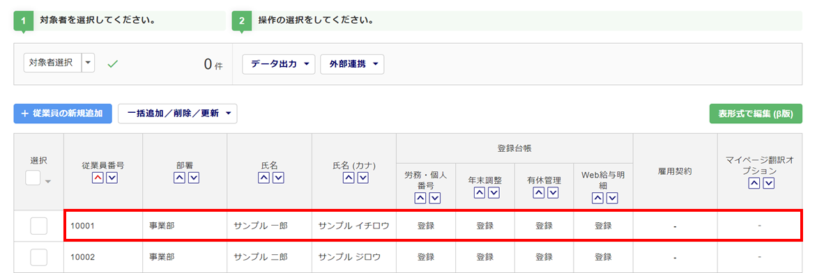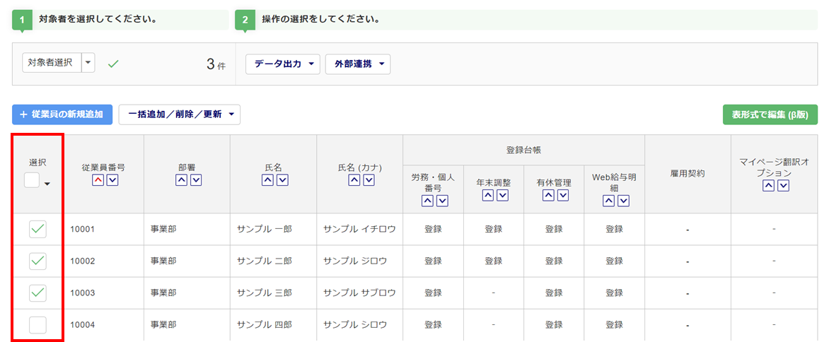 データを登録・更新する従業員の「選択」列にチェックをつけます。