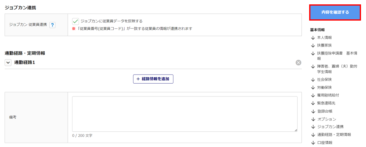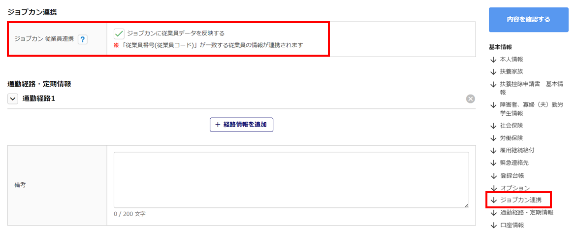 「ジョブカン連携」の項目で「ジョブカンに従業員データを反映する」にチェックをつけます。