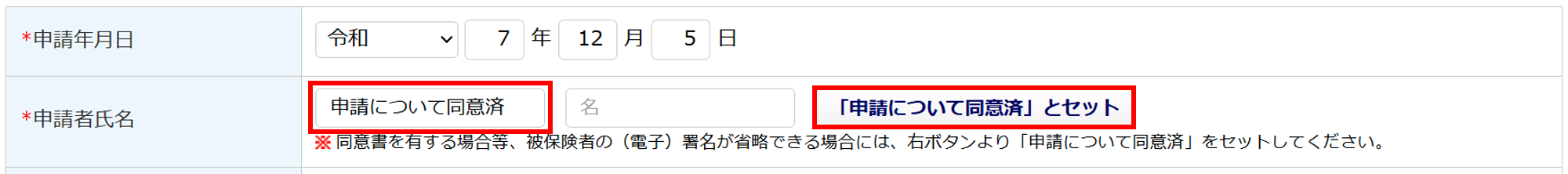 被保険者から申請等に係る同意書が提出された場合、[「申請について同意済」とセット]をクリックすると、「姓」欄に「申請について同意済」がセットされます。