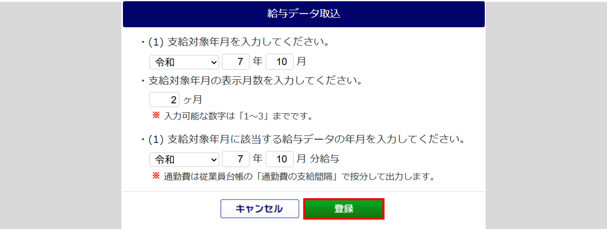 | 支給対象年月の表示月数 | 1カ月~3カ月いずれかの支給対象年月を入力します。 ※初期値は「2カ月」です。 |