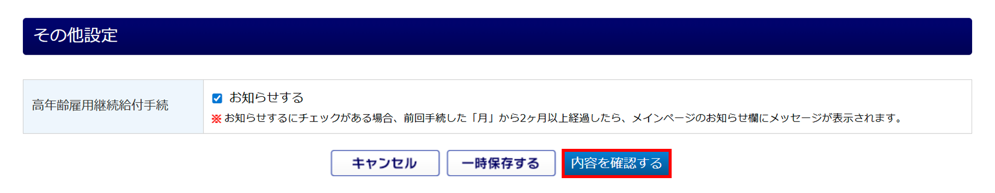 「お知らせする」にチェックすると、前回雇用継続給付手続きをした「月」から2カ月以上経過した場合に、メインページ「オフィスステーションからの通知」にてメッセージが表示されます。