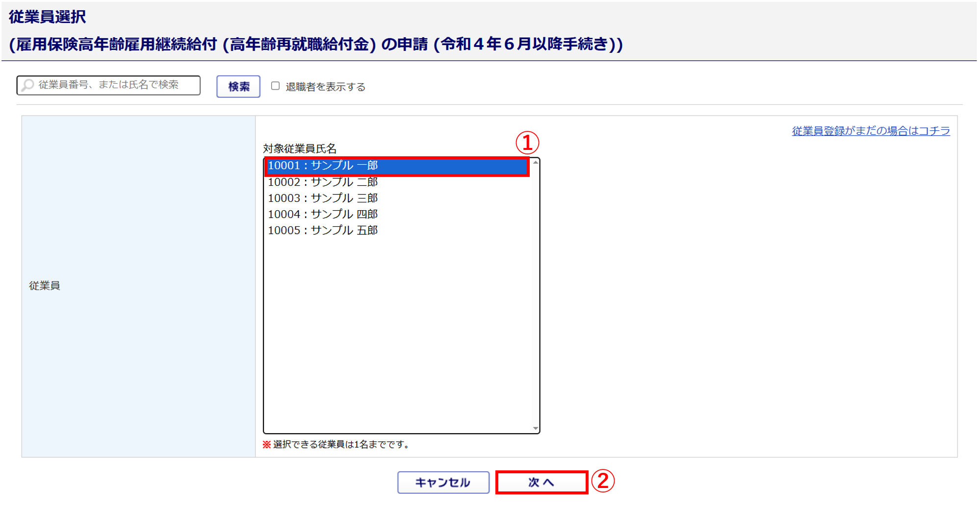 「対象従業員氏名」(①)を選択し、[次へ](➁)をクリックします。