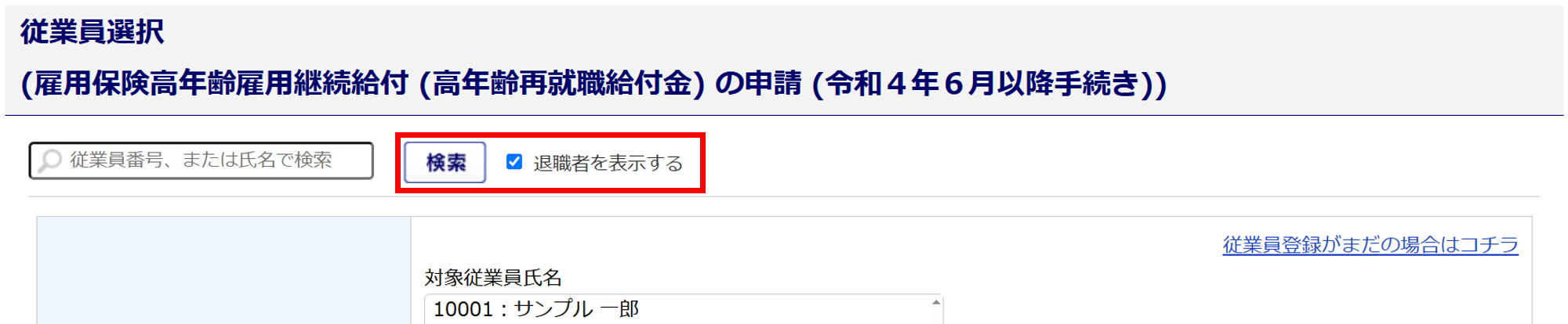 「退職者を表示する」にチェック、[検索]をクリックすると退職者が表示されます。