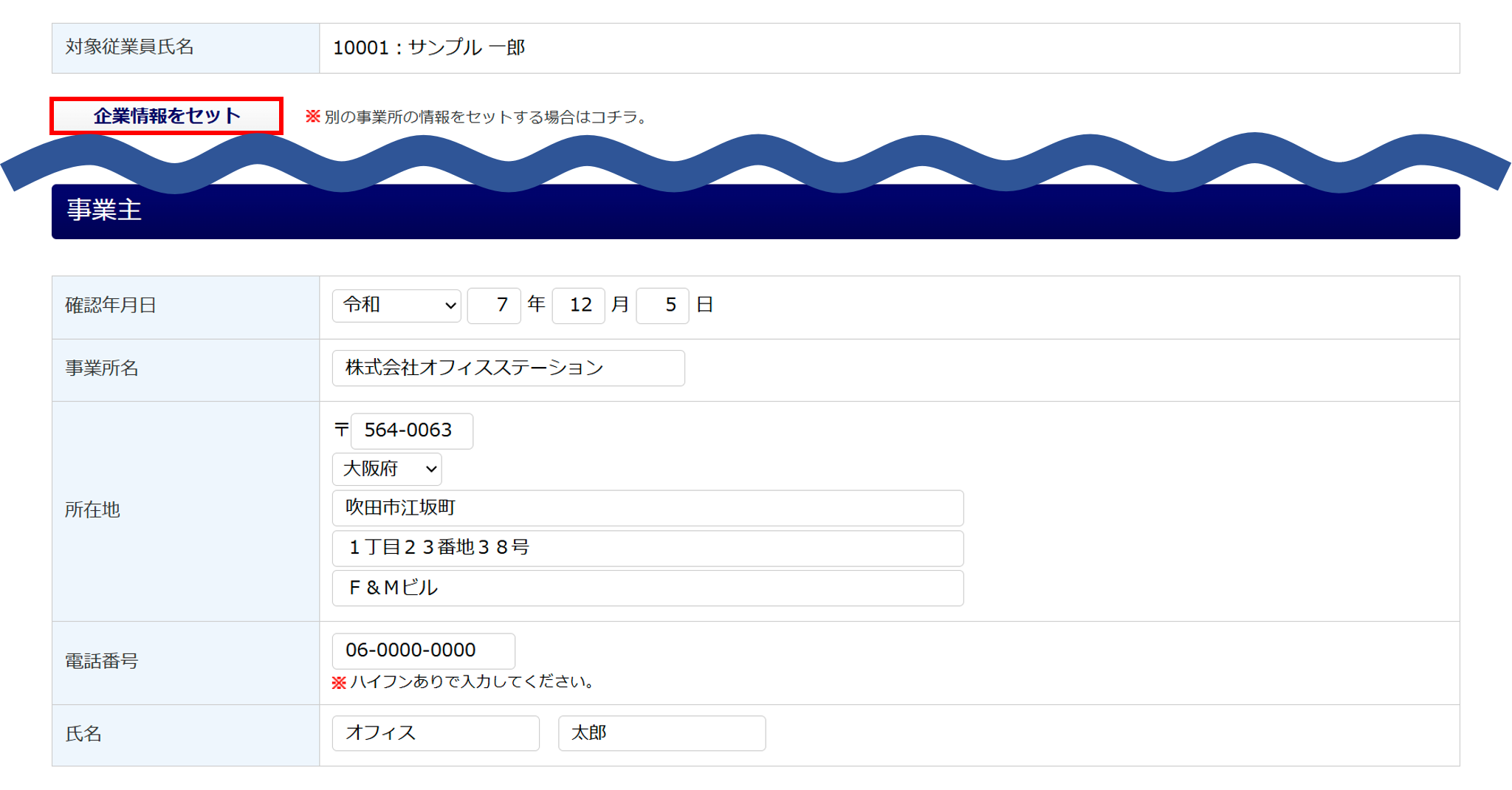 事業主の情報は、「企業設定」もしくは、「士業用顧問先管理」の情報を引用しています。