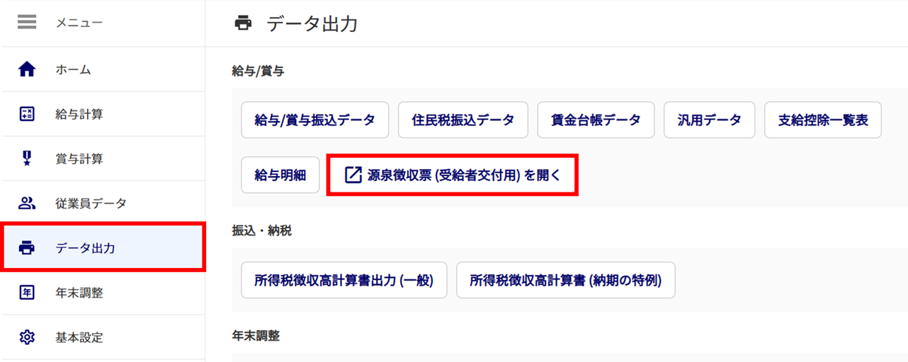 メニュー[データ出力]>[源泉徴収票(受給者交付用)を開く]>[遷移する]をクリックします。