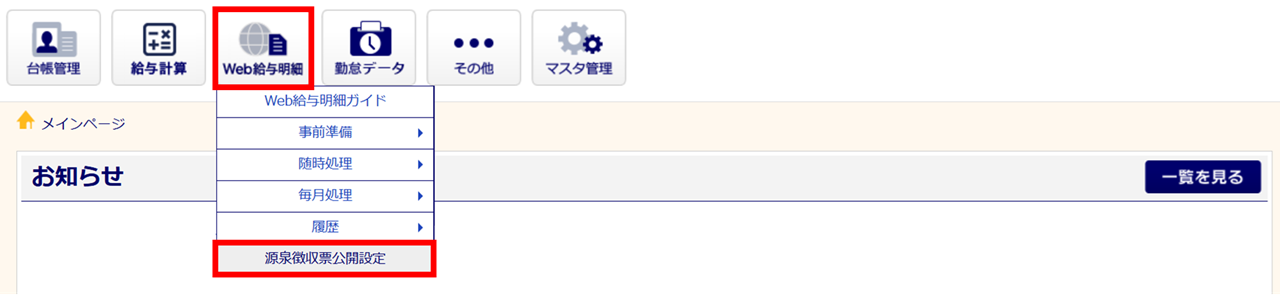 [Web給与明細]>[源泉徴収票公開設定]をクリックします。