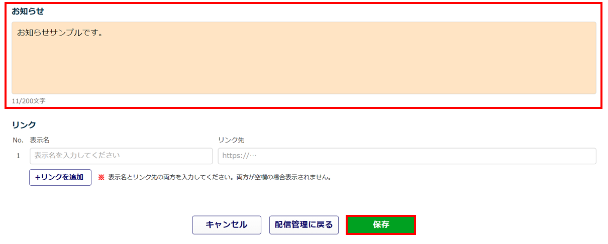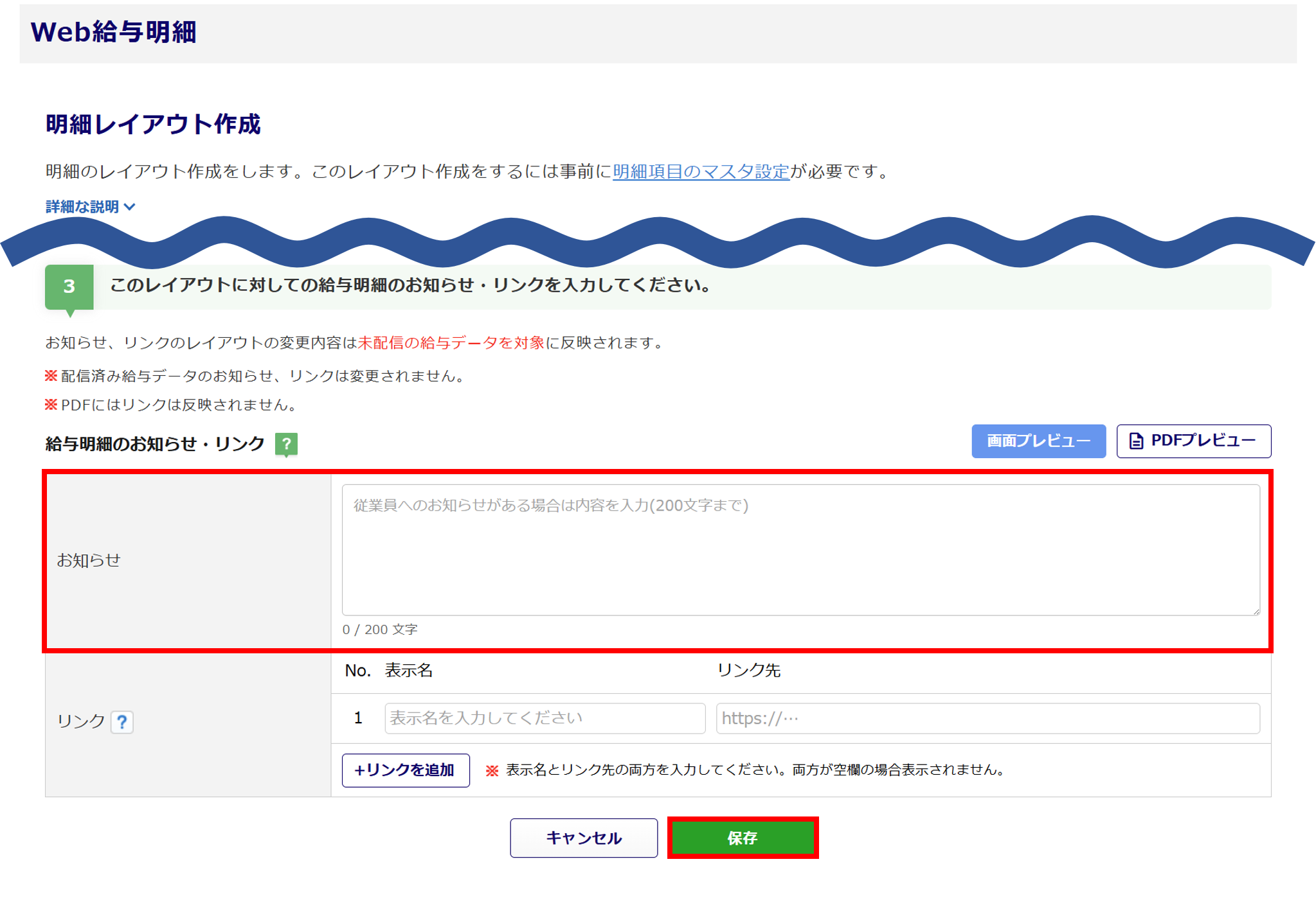 「給与明細のお知らせ・リンク」の「お知らせ」を入力し、[保存]をクリックします。
