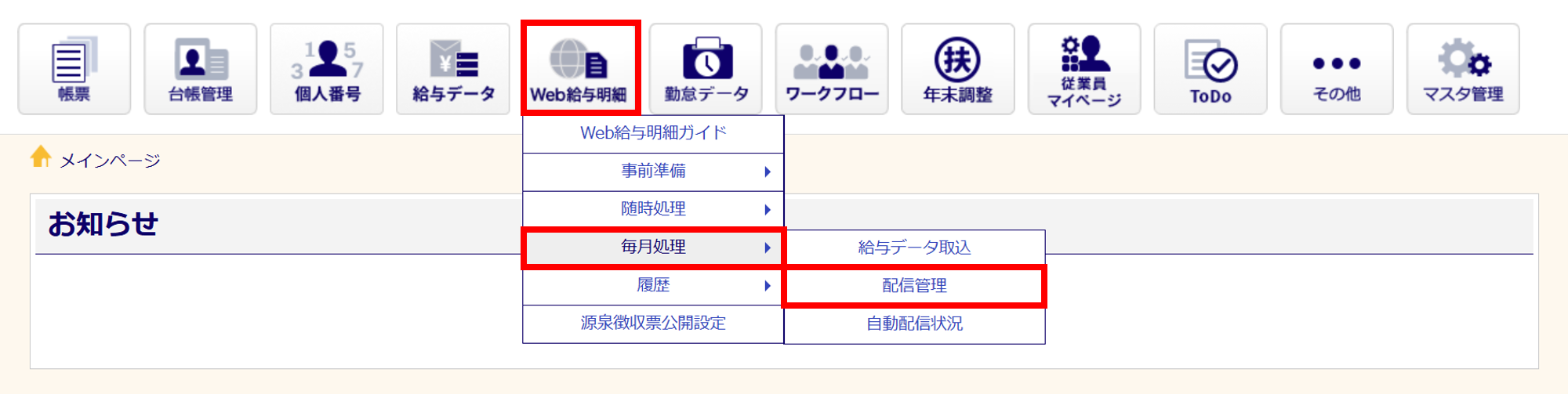[Web給与明細]>[毎月処理]>[配信管理]をクリックします。