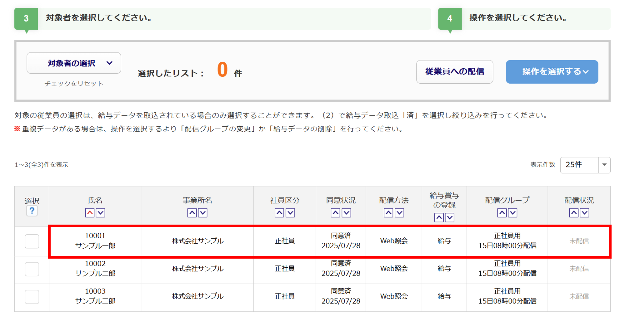[配信管理]の各従業員の給与明細画面で設定する場合