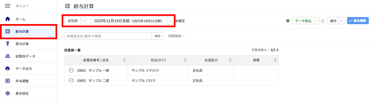 メニュー[給与計算]をクリックし、「支給グループ」および「支給日」を選択します。