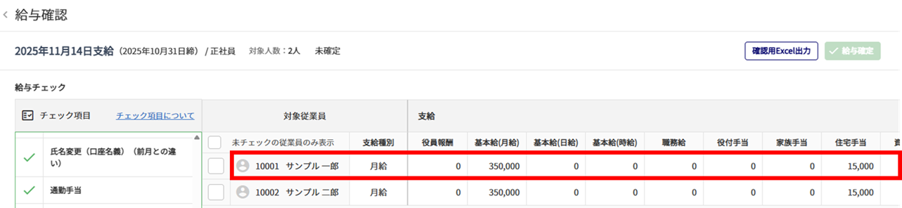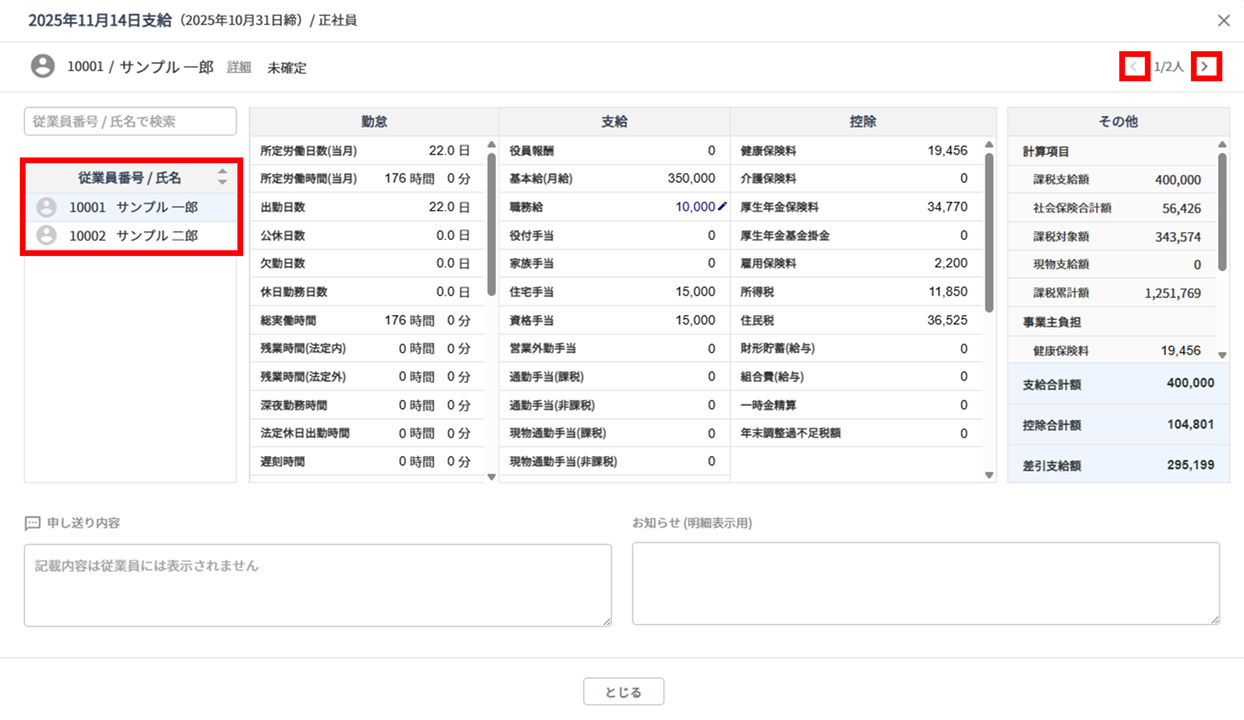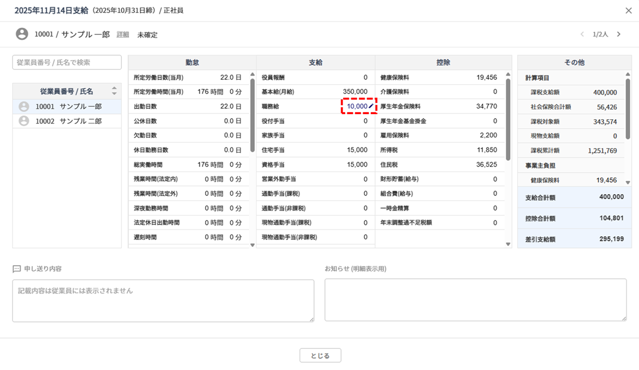 「給与確認(賞与確認)」画面からも、対象従業員をクリックすると、個別編集画面が開きます。