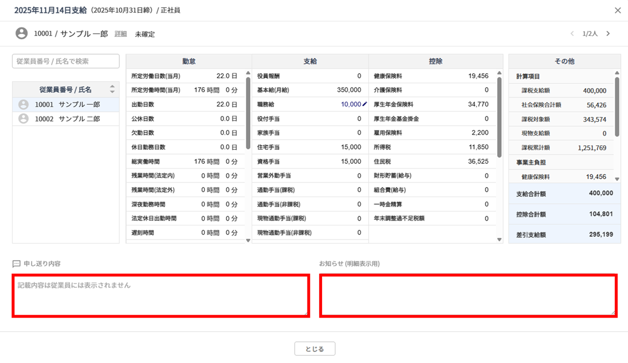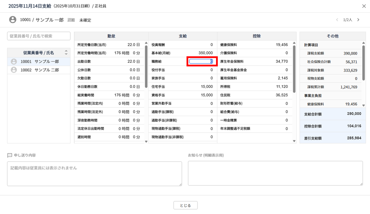 給与計算および賞与計算時に、従業員ごとに金額やお知らせ欄を個別に手入力で編集する方法について、ご説明します。