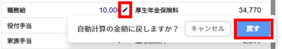 「勤怠」「支給」「控除」項目の金額部分をクリックし、手入力します。