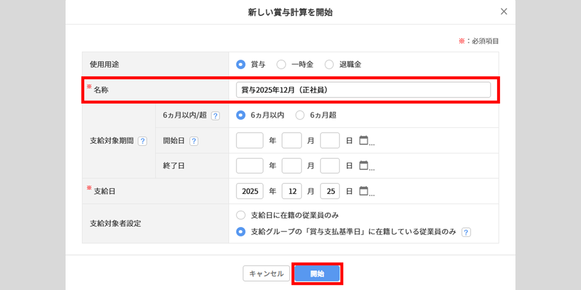 「新しい賞与計算を開始」画面にて、「名称」にわかりやすい名称(支給グループ名を含む名称等)を入力します。