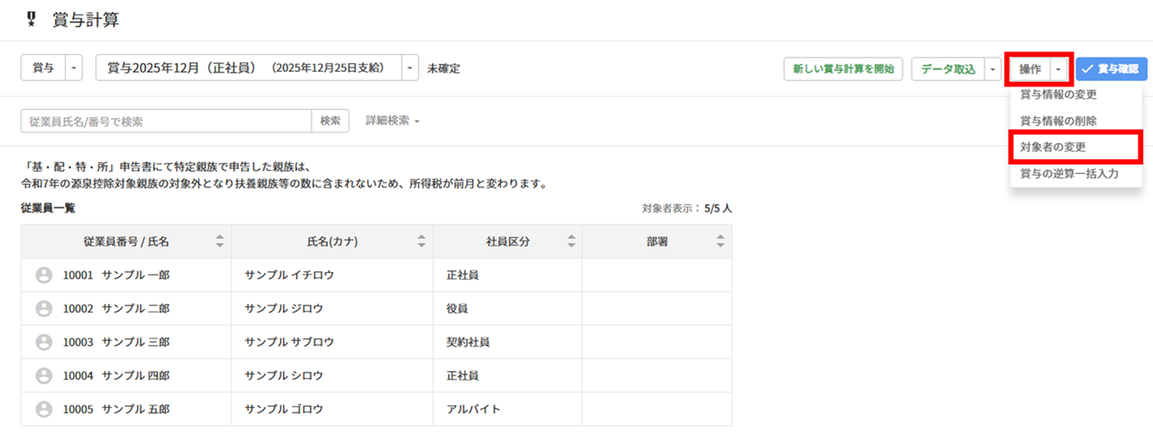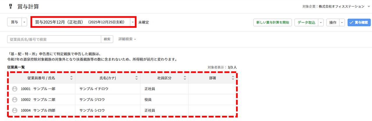 賞与計算の対象者のみ従業員一覧に表示されます。