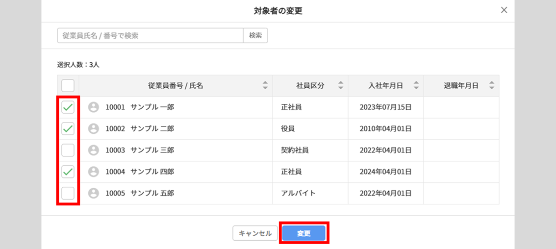 入力した名称で賞与計算をおこなう対象者以外のチェックを外し、[変更]>[はい]をクリックします。