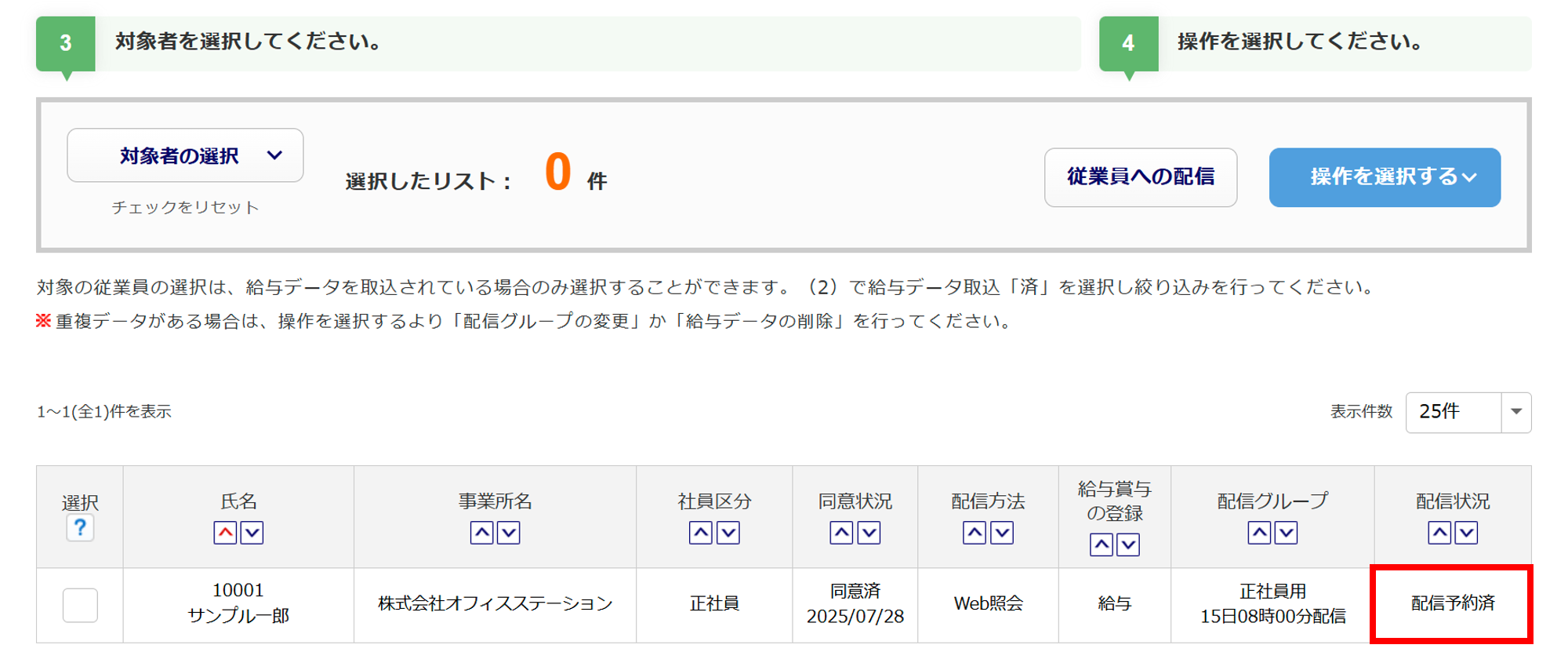 「ステータス」が「配信予約取消」と変更されたら、「配信管理」画面から従業員へ給与明細を配信することができます。