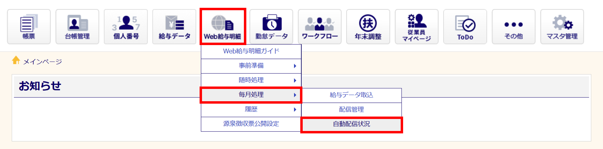 [Web給与明細]>[毎月処理]>[自動配信状況]をクリックします。